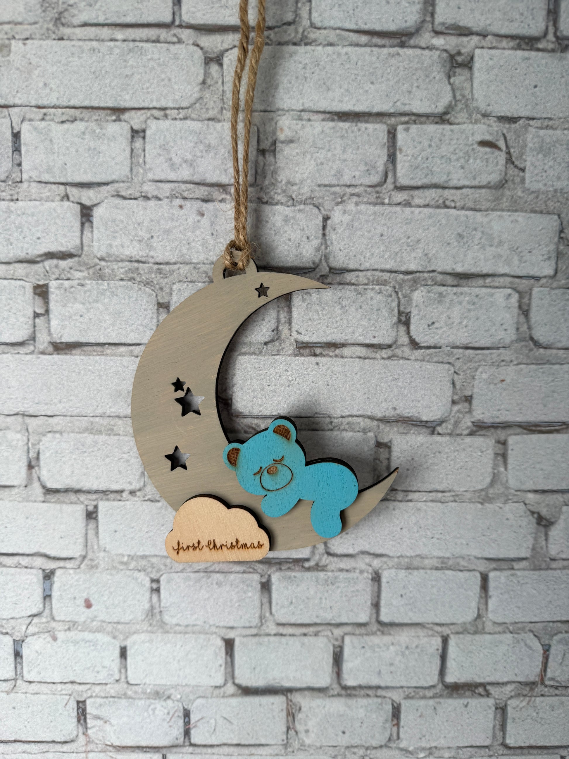 Celebrate a baby’s first Christmas with this charming hand-crafted ornament featuring a sleepy blue bear nestled on a crescent moon. Laser cut and hand painted with care, it also includes a small cloud where you can laser engrave any name for a special personalized touch. Perfect for adding a playful and heartwarming accent to your holiday décor.