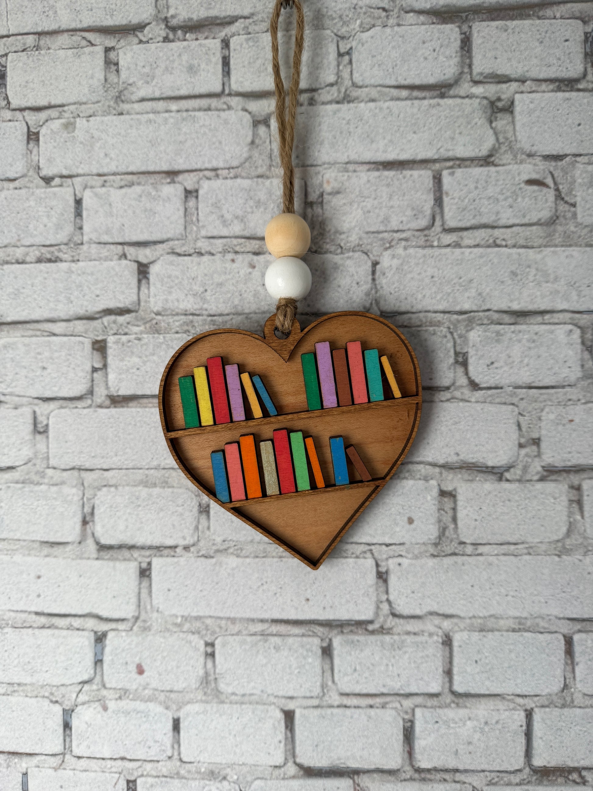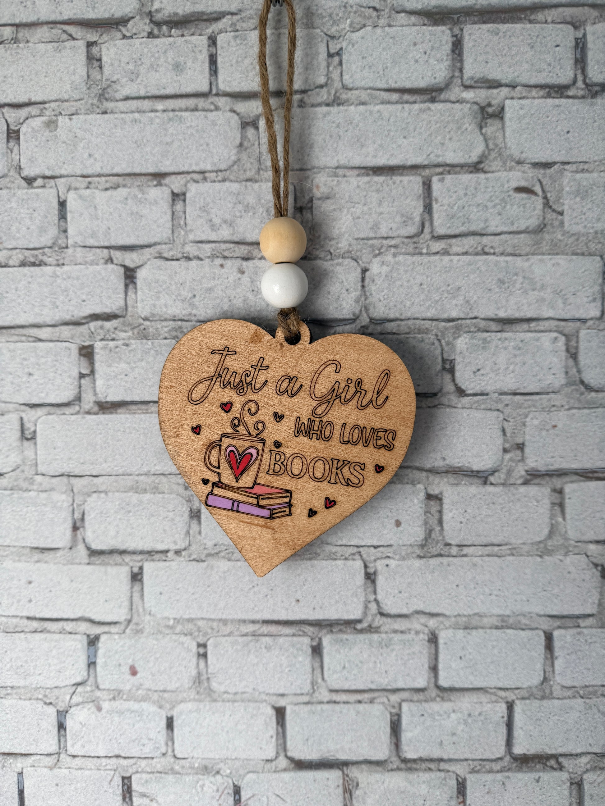 Celebrate the joy of reading with this charming wooden heart-shaped ornament. Laser cut to perfection and hand painted with vibrant colors, it features the playful phrase "Just a Girl and her Books" on one side, while the reverse reveals a colorful bookshelf brimming with favorite stories. Perfect for book lovers, this ornament adds a touch of whimsy to any space.